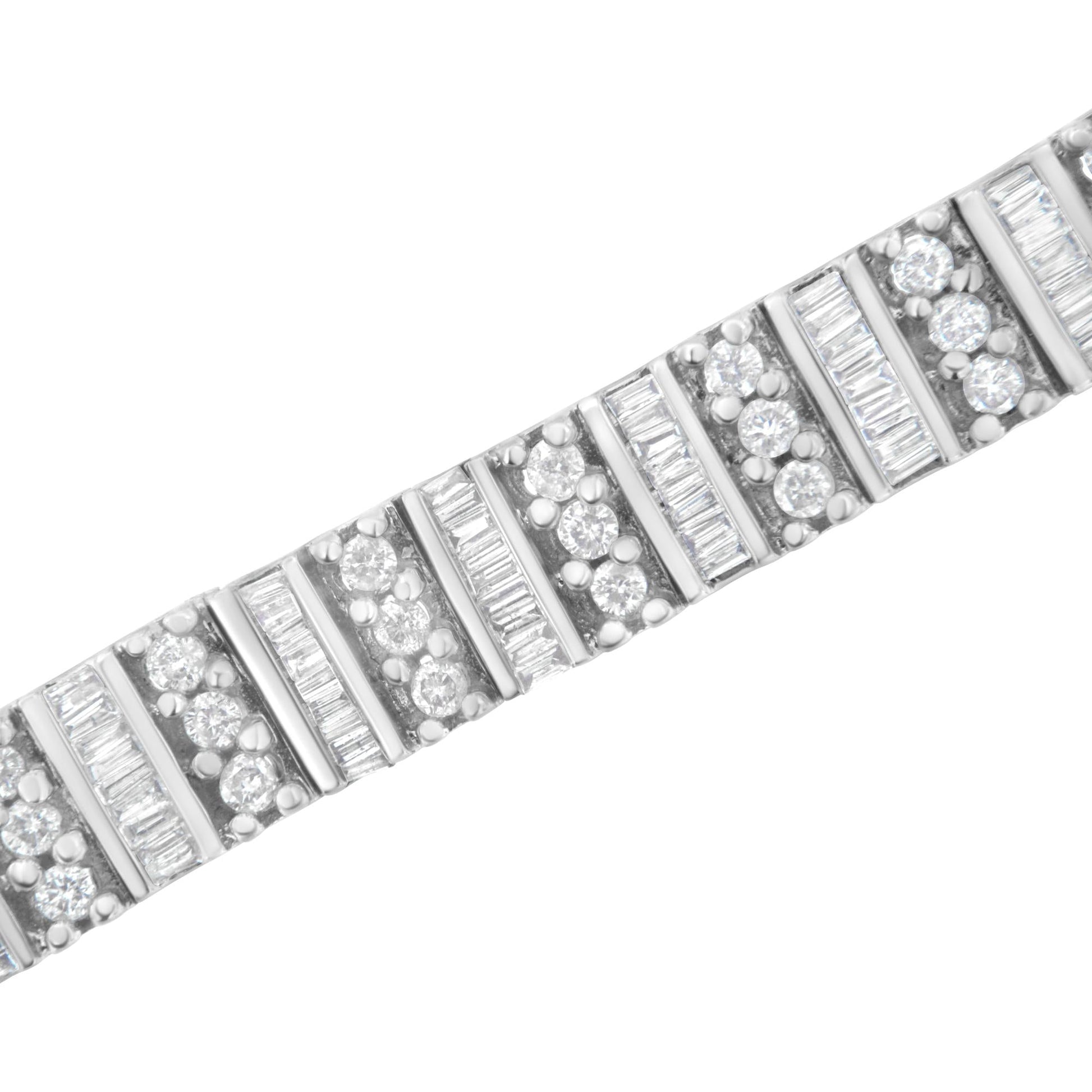 Embellish your wrist with this striking 14k white gold bracelet. 4 7/8ct TDW of dazzling diamonds are displayed in this design. Each of the links in the bracelet features two vertical rows of diamonds. A prong set round cut diamond row sits besides channel set baguette cut diamonds. A box clasp keeps the bracelet secure.