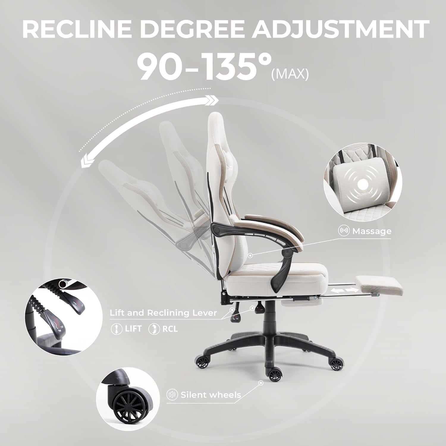 - [Meeting Daily Needs] Users can recline up to 135 degrees on the backrest, making it suitable for various scenarios such as gaming, working, and relaxation. The lumbar pillow and headrest provide much-needed support, alleviating the strain on the lower back and neck during extended periods of sitting.