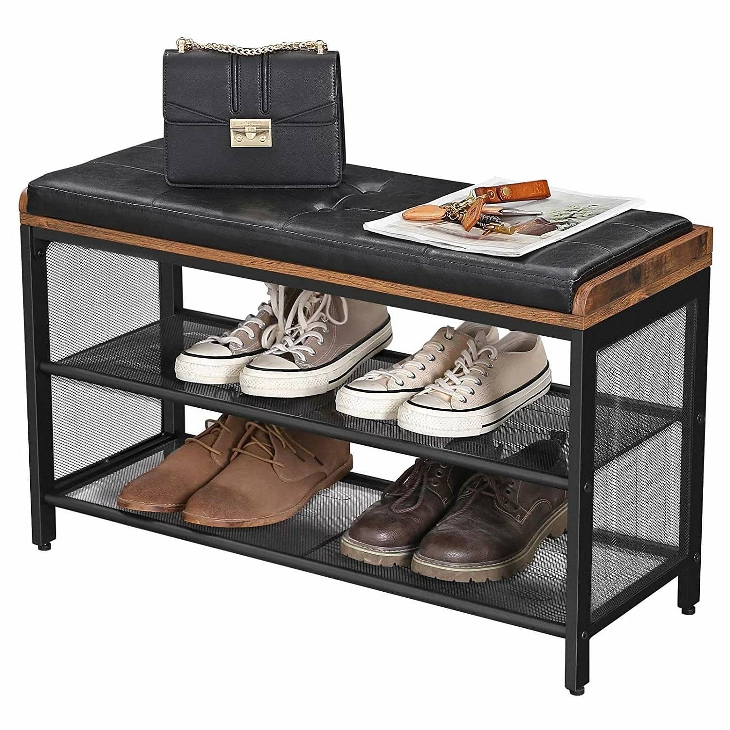 - Black Metal Entryway Shoe Rack Storage Bench with Padded Seat Cushion