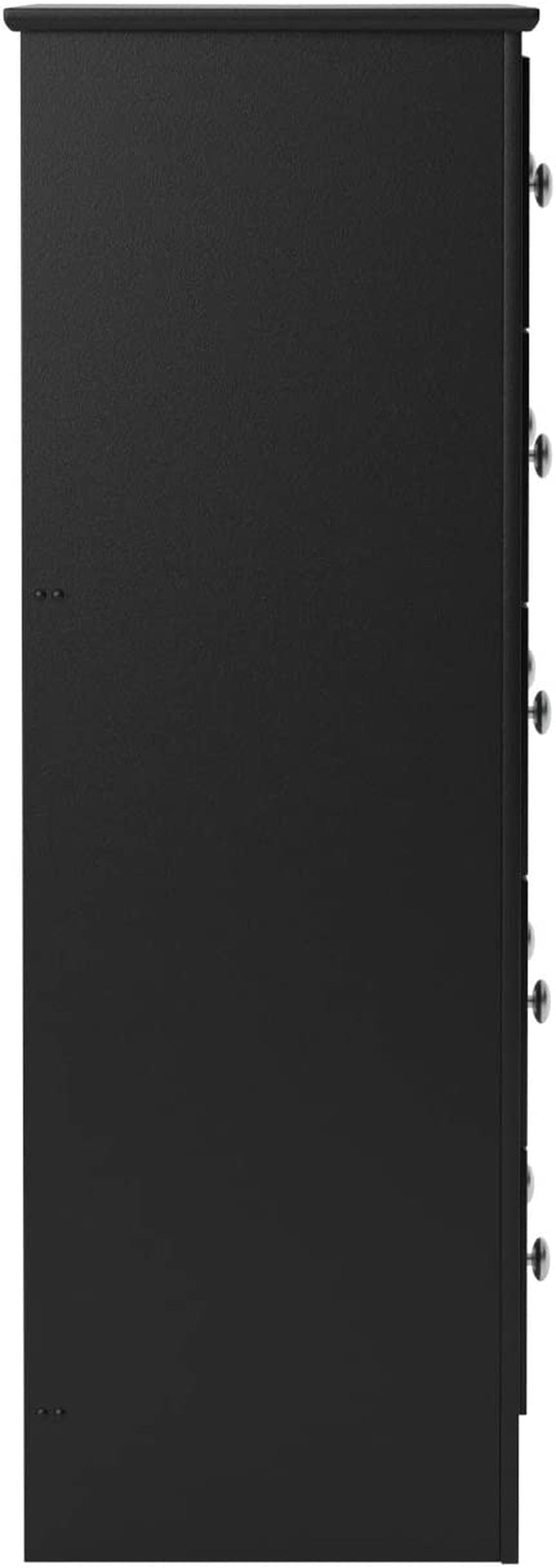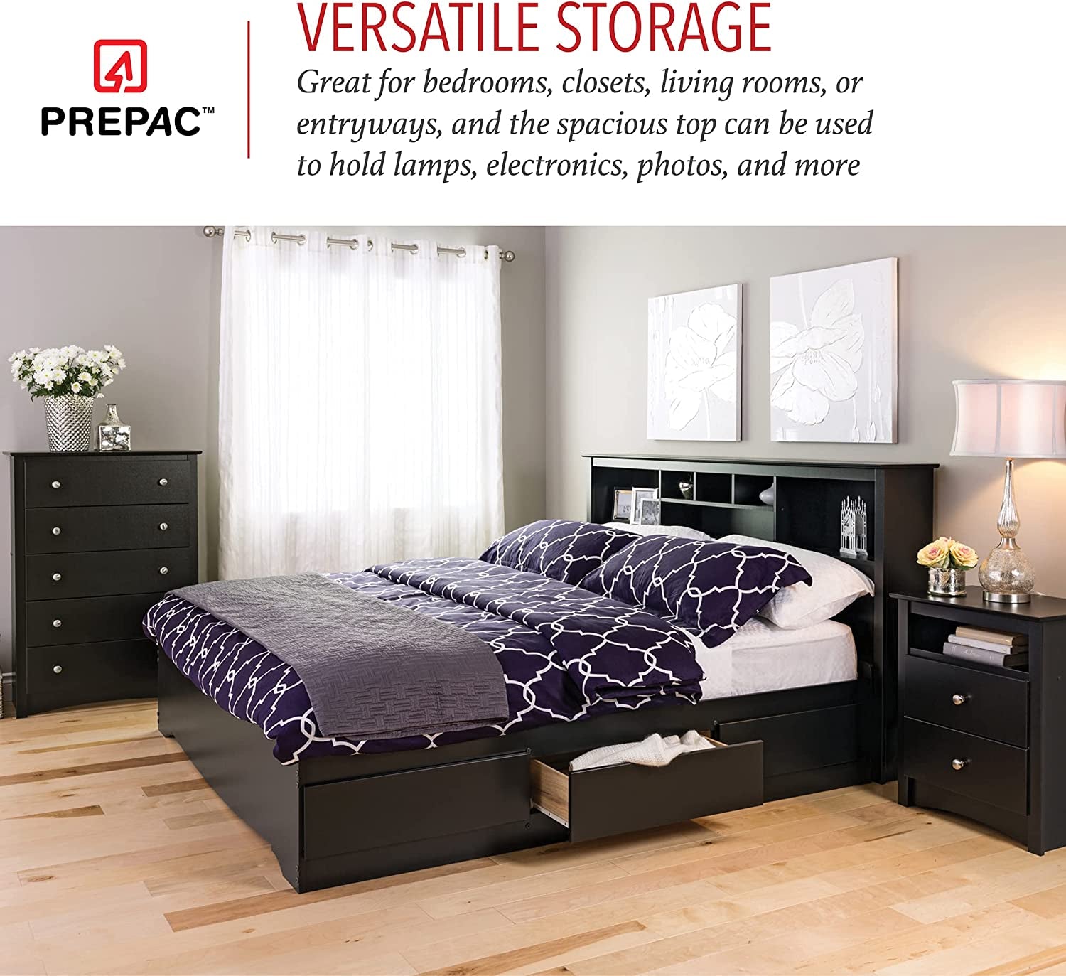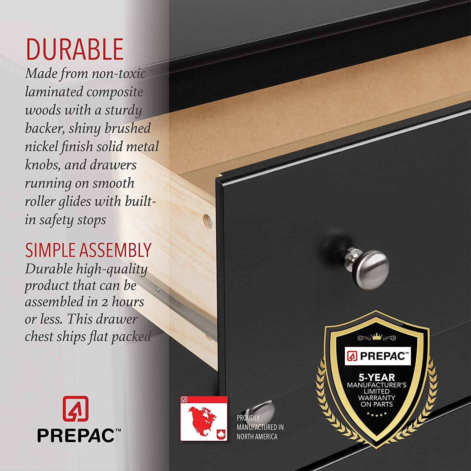 Put a modern spin on your classic staple with the Prepac Sonoma 5 Drawer Chest. A profiled flat top, sleek side moldings, and curved kick plate form a contemporary and modern design with a black laminate finish that makes this a beautiful and chic bedroom chest dresser. This tall chest houses five full-size storage drawers for clothes, running on smooth roller glides with built-in safety stops and brushed nickel metal knobs. This compact multi-drawer organizer is a space-saving clothes organizer for bedrooms, but it also acts as a storage cabinet in your walk-in closet, nursery, living room, or entryway. This versatile standing chest of drawers can serve as a TV stand or display for small lamps, electronics, picture frames, and more. Made from a non-toxic laminated composite wood with a sturdy back panel for reliable storage, this high-quality chest ships flat packed and can be assembled in two hours or less. Measuring 16" D x 31.5" W x 45.25" H with each deep drawer measuring 12.5" D x 24.75" W x 5" H, this vertical standing chest is a must-have piece of bedroom furniture. Pair this all-purpose chest with other items from the Sonoma collection for a uniform bedroom set.