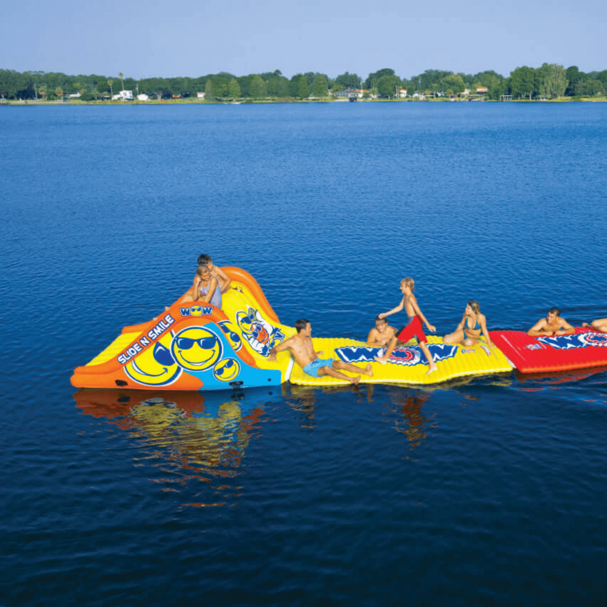 Want a way to keep your kids happy at the lake? Get them the Slide N Smile from WOW. The Slide and Smile is a giant 2 lane slide for the water. It is over 9 feet long, 6 feet wide and 4 feet tall. You can use the two grommets on the side to tie it to your dock or you can use the zipper connection system to connect it to one of our 10’x6′ or 6’x6′ Water Walkways or Water Mats. You can make a playground on the water 20′ long, 30′ long, 40′ long or more. The Slide N Smile can be used as a slide to your swimming pool as well. The Slide N Smile gives all kinds of options and uses to build your very own WOW Water World playground.
