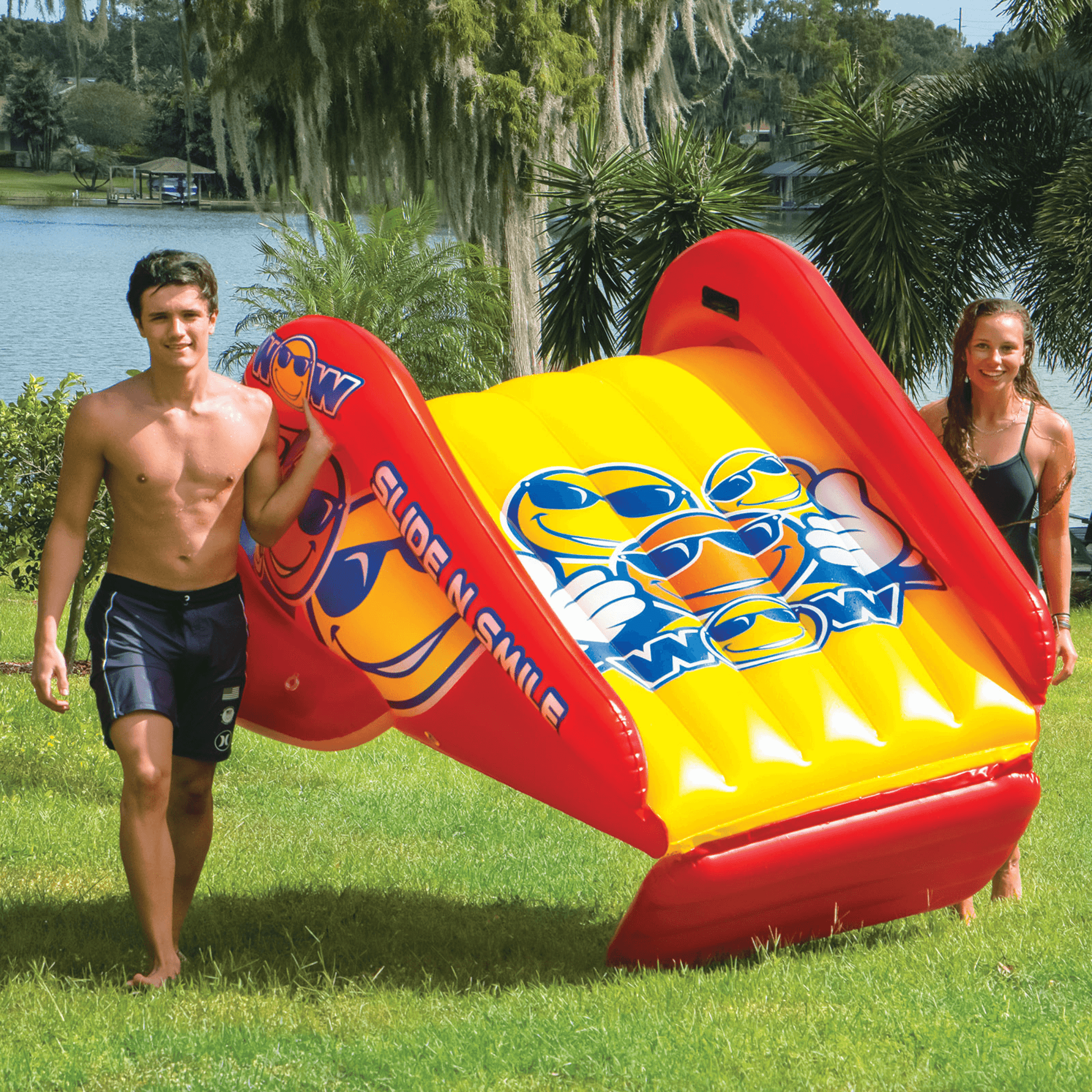 Make any pool a COOL POOL with WOW's Slide N Smile Soaker Sprinkler Pool Slide. This easy-to-set-up inflatable has WOW water ballast pontoons for secure stable sliding. Built-in soaker sprinkler creates a wet fast sliding surface that connects easily to any standard garden hose. EZ boarding step design with molded handles. At the bottom of the slide, there is a WOW slide bumper for easy entry into the water.